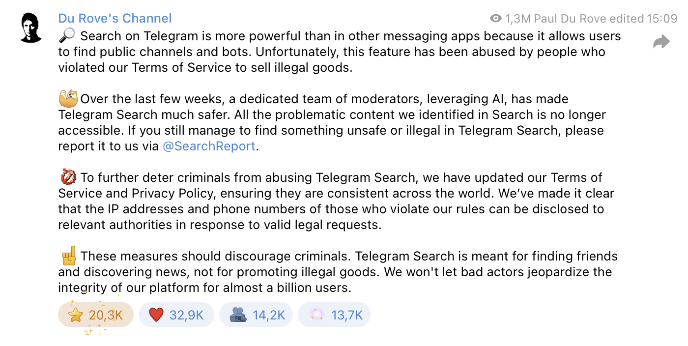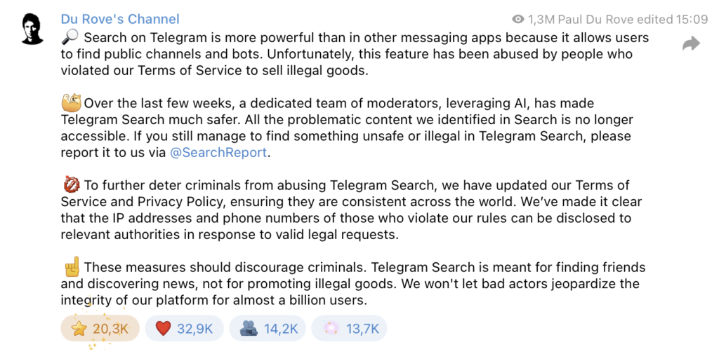 Durov ha spiegato che la nuova policy ha lo scopo di tutelare la piattaforma da una minoranza di utenti coinvolti in attività illecite, che rischiano di danneggiare la reputazione dell’intera piattaforma. “Lo 0.001% degli utenti che commette crimini danneggia l’immagine di tutti noi,” ha affermato Durov in un recente post su Telegram. Tuttavia, questo cambiamento ha generato reazioni contrastanti, soprattutto per il ruolo di Telegram come rifugio sicuro per dissidenti politici e attivisti in paesi con regimi repressivi.