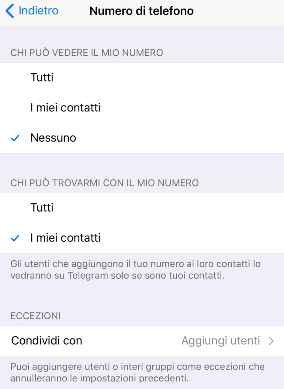 Nella schermata Numero di telefono, è possibile impostare con maggiore precisione chi può vedere il nostro numero di telefono (chiaramente, sempre che non abbiano comunque già il nostro numero salvato nella loro rubrica). Questa funzionalità consente di restringere tale possibilità, ma anche di indicare in modo più granulare le eccezioni che possono essere vantaggiose nel nostro lavoro.
