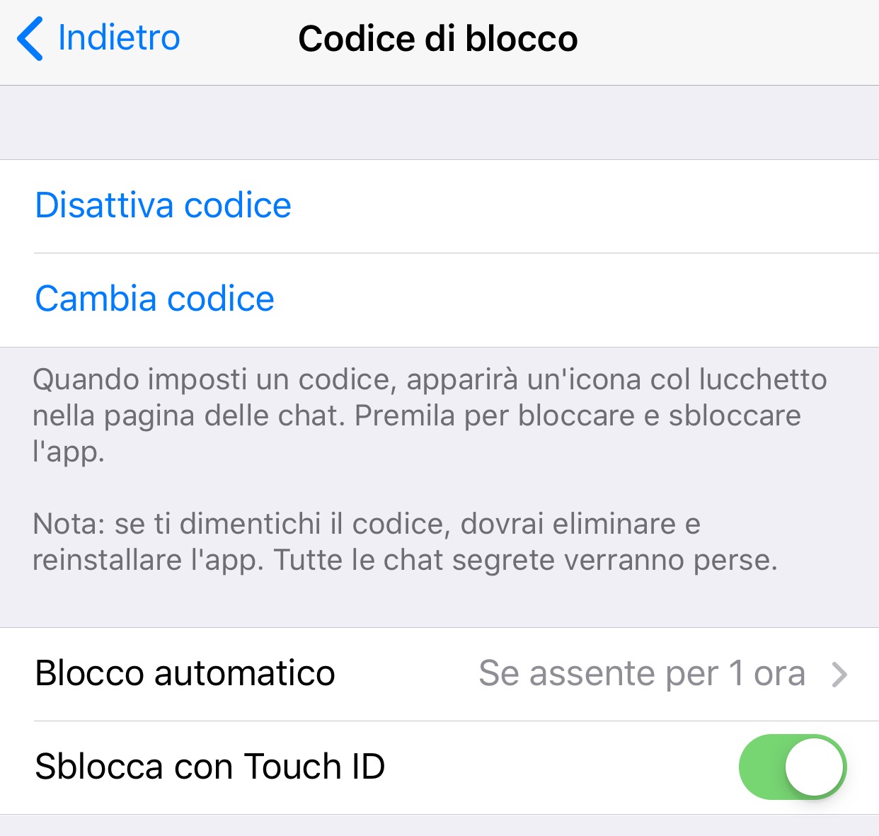 Dopo aver impostato il codice, in questa schermata delle impostazioni è poi possibile gestirlo disattivandolo e cambiandolo, così come configurando il blocco automatico (e l’intervallo di tempo per attivarlo) e la possibilità di sbloccare con il Touch ID.