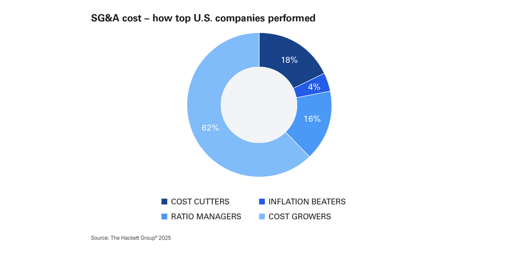 The study – based on an analysis of the 1,000 largest U.S.-headquartered public companies – found that 62% saw SG&A costs rise as a share of revenue, and 78% failed to keep cost growth below inflation, despite inflation dropping to 2.9%. Only 17.9% of companies reduced SG&A costs year over year, and just one-quarter of last year’s cost cutters sustained that performance. The Hackett Group’s analysis highlights a substantial seven-percentage-point performance gap between first-quartile and median companies.