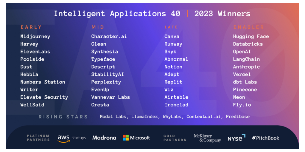 The list is being released two weeks before the Intelligent Applications Summit, where leaders in the space will discuss issues, challenges and innovations in AI. Hosted in partnership with Microsoft, AWS for Startups, NYSE Group, McKinsey, and PitchBook, the IA Summit will be held in Seattle on October 10th and 11th. IA40 Summit