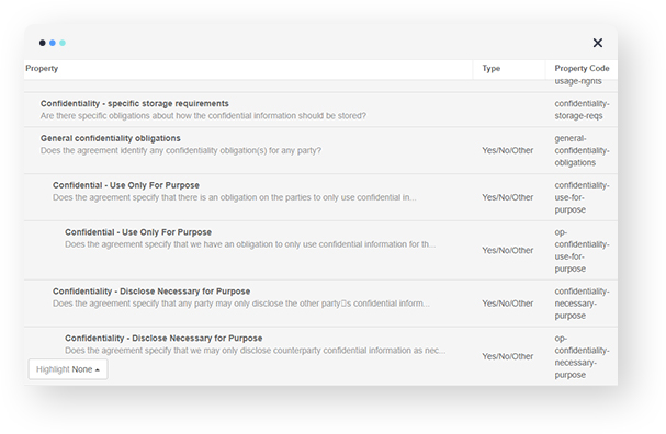 Il framework di descrizione dei contratti Lexible, sviluppato dagli avvocati di ThoughtRiver e da partner esperti di settore, è un’ontologia di proprietà basate sul significato che, combinate, incapsulano la complessa logica giuridica e le relazioni presenti in un accordo: il framework comprende migliaia di singole domande che insieme creano un quadro granulare di obblighi e diritti all’interno di un documento.