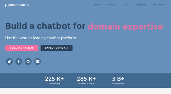 Progettato per l’implementazione come parte di app o servizi, Pandorabots è un servizio web per la costruzione e la distribuzione di chatbot. La piattaforma Pandorabots è uno dei più antichi e più grandi servizi di hosting chatbot del mondo.
