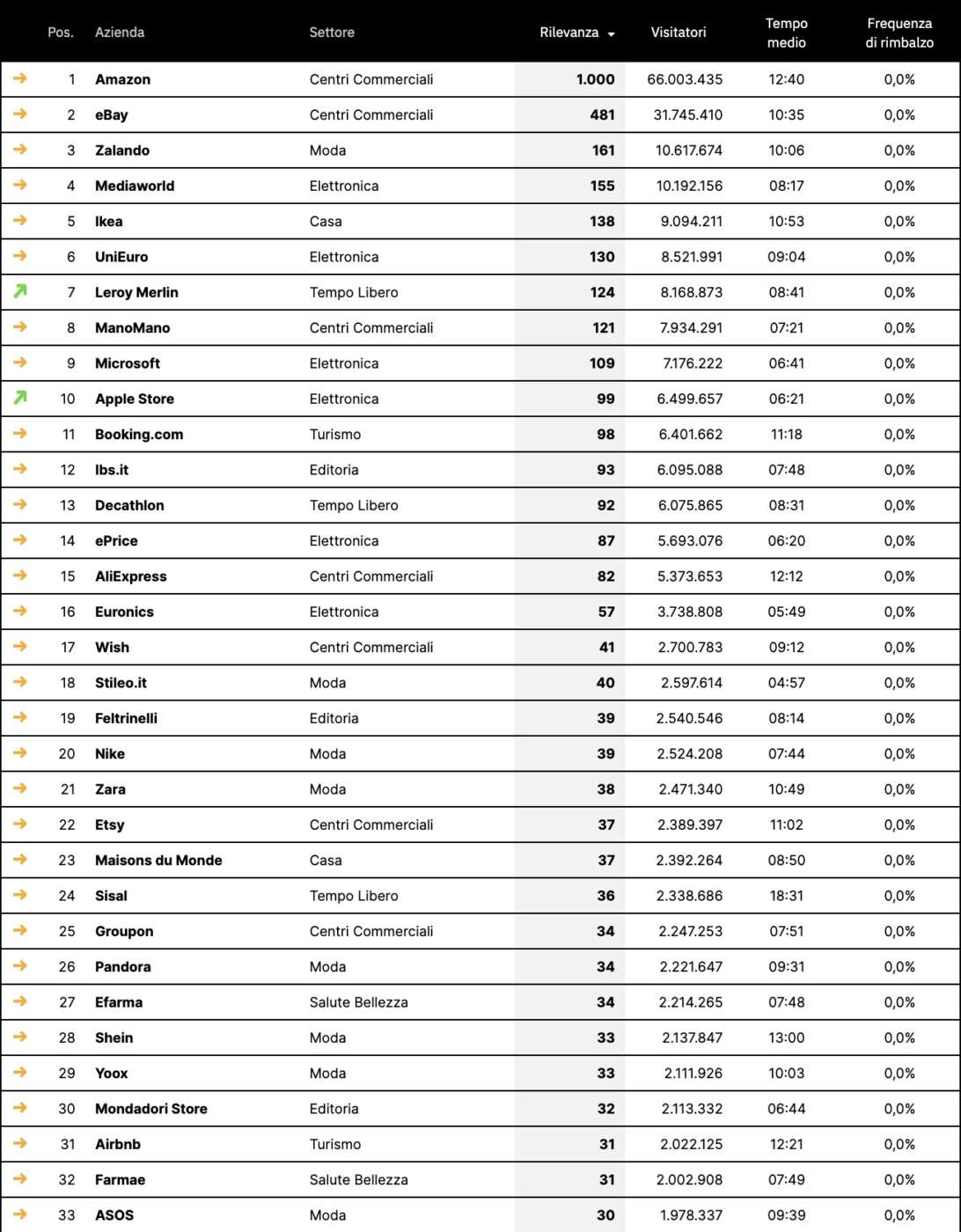 Di seguito riportiamo la classifica dei principali cento operatori nel settore ecommerce nazionale elaborata da Casaleggio Associati (con dati al 3 maggio 2021).