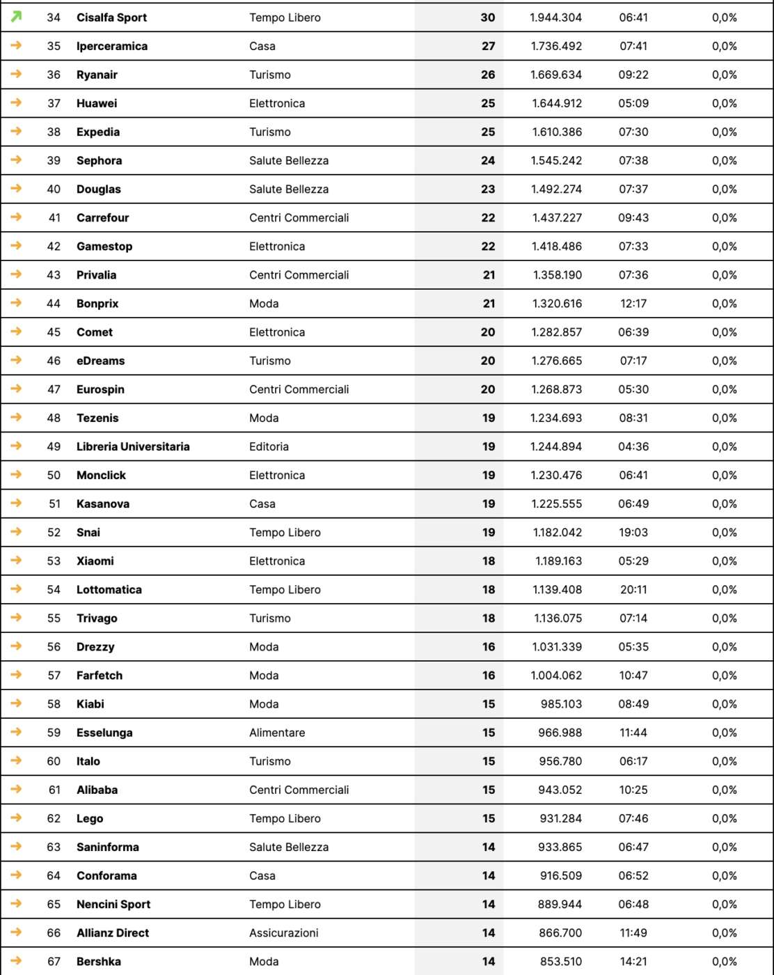 La classifica è basata su stime di dati reperibili online, non ha valore statistico ma è indicativa dei rapporti di forza.Oltre alla stima dei visitatori unici al mese, vengono considerati il tempo sul sito web, la frequenza di rimbalzo e la stima della rilevanza del brand.