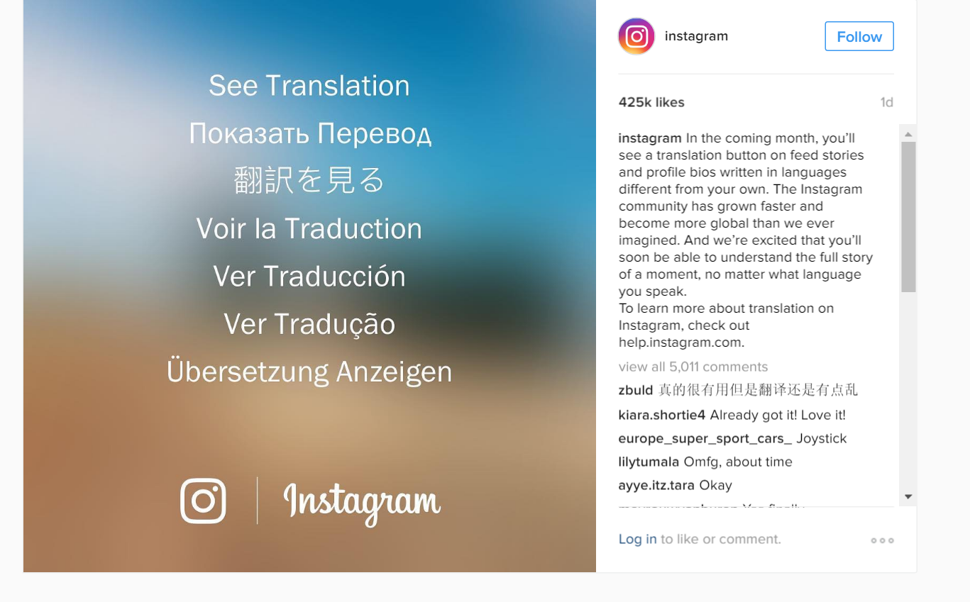 A partire dal prossimo mese Instagram dovrebbe varare un servizio di traduzione automatica, che consentirà di tradurre automaticamente commenti, citazioni, informazioni sulle bio degli utenti.