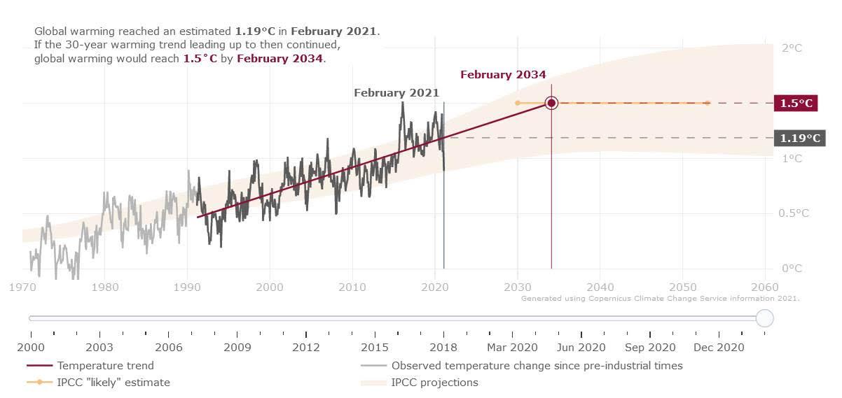L’applicazione, sottolinea Copernicus, fornisce una scala indicizzata per esplorare il cambiamento di temperatura rispetto al periodo pre-industriale per qualsiasi punto tra il 2000 e oggi. Una linea rossa che mostra il tasso medio di riscaldamento negli ultimi 30 anni è estesa nel futuro fino al raggiungimento del limite di 1,5° C.