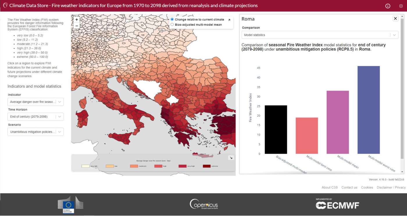Una di queste applicazioni è il nuovo sistema Fire Weather Index (FWI) che assume la forma di una mappa interattiva per aiutare l’utente a studiare il pericolo di incendio attuale e futuro in qualsiasi regione amministrativa in Europa.