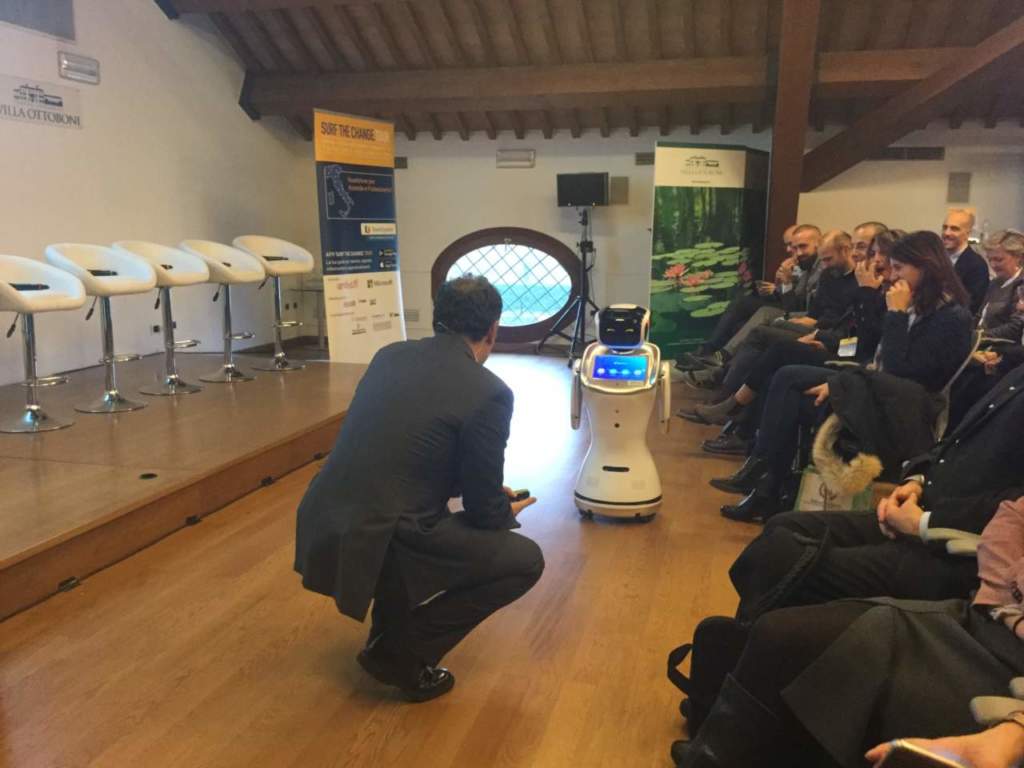 Un fuori programma dell’incontro ha suggellato il concetto di trasformazione digitale e lo collega all’automazione. Durante la propria esposizione, il direttore marketing di TeamSystem, Daniele Lombardo, si è relazionato con il robot realizzato dalla patavina Omitech, dotato di funzioni di machine learning e di un vocabolario in cloud.