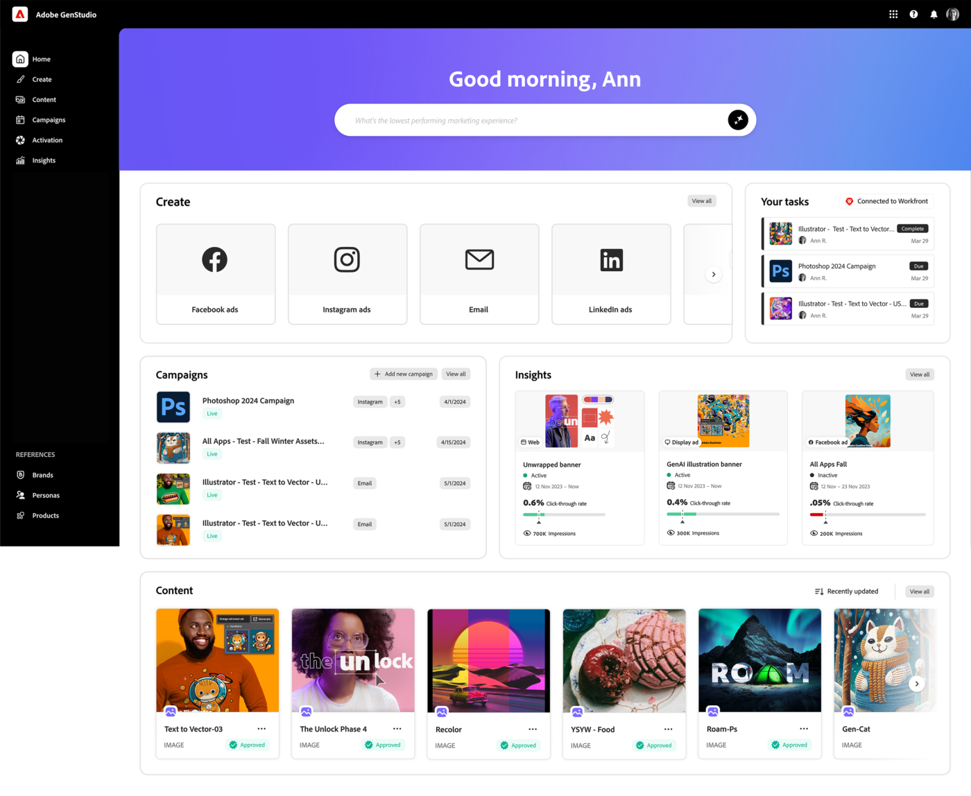 Adobe dispone di una serie integrata di prodotti best-in-class per aiutare le aziende ad automatizzare e ottimizzare la supply chain dei contenuti. Con Adobe GenStudio, Adobe rilascerà una nuova offerta basata sull’AI generativa che consente ai team di marketing di pianificare, creare, gestire, attivare e misurare rapidamente i contenuti on-brand.