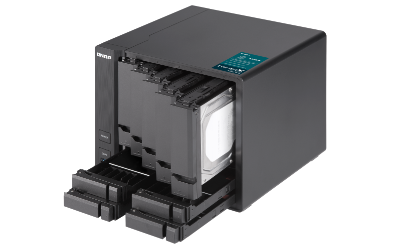 Il NAS è caratterizzato da un design ibrido per lo storage. Dispone infatti di cinque vani per dischi da 3,5” e di quattro vani per SSD da 2,5”. In totale supporta dunque fino a nove dischi nello stesso spazio fisico che solitamente occupa un NAS a cinque vani.