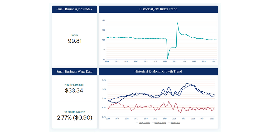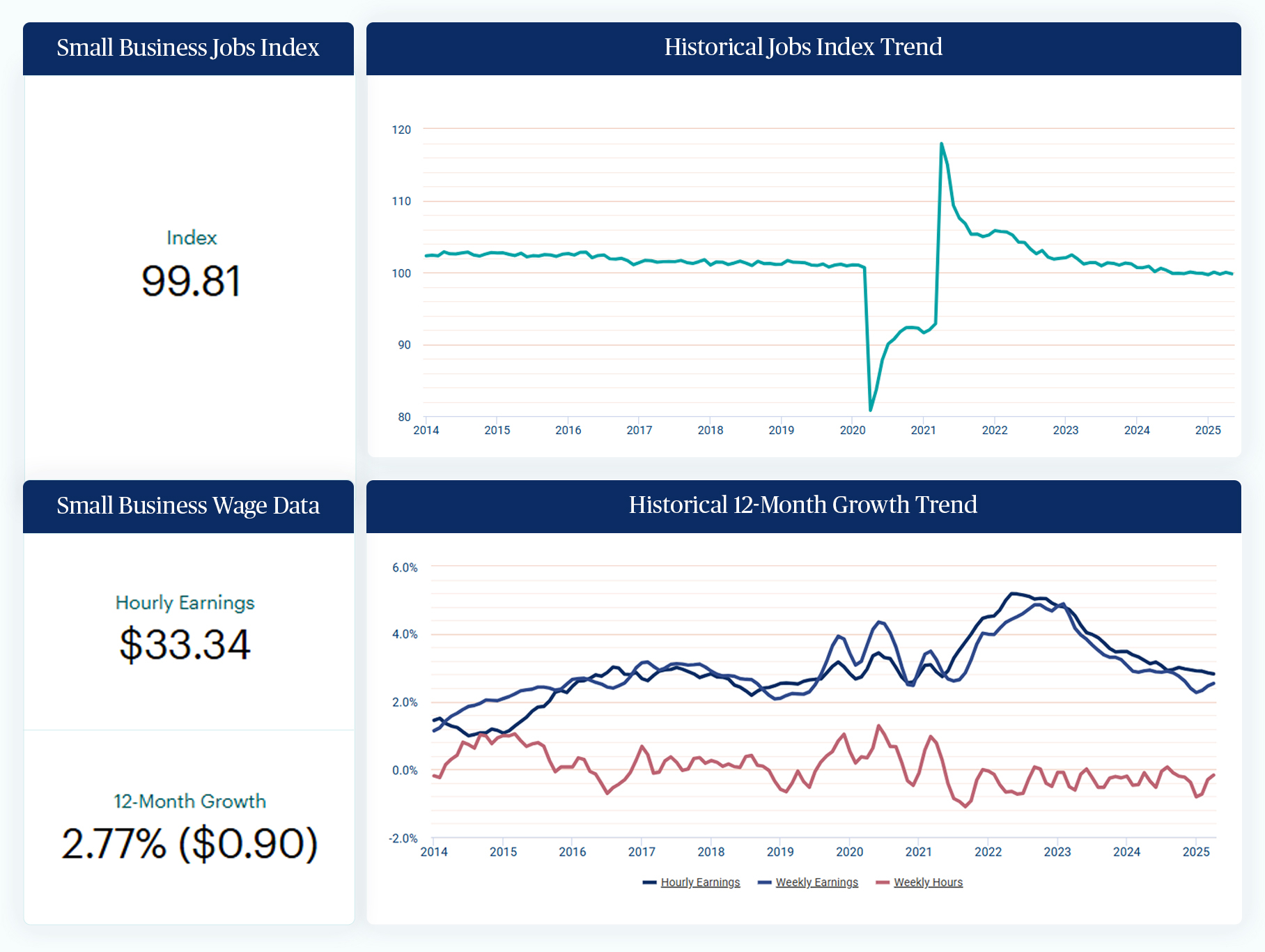 • At 99.81 in May, the national Small Business Jobs Index continued to report steady, flat employment growth in 2025.