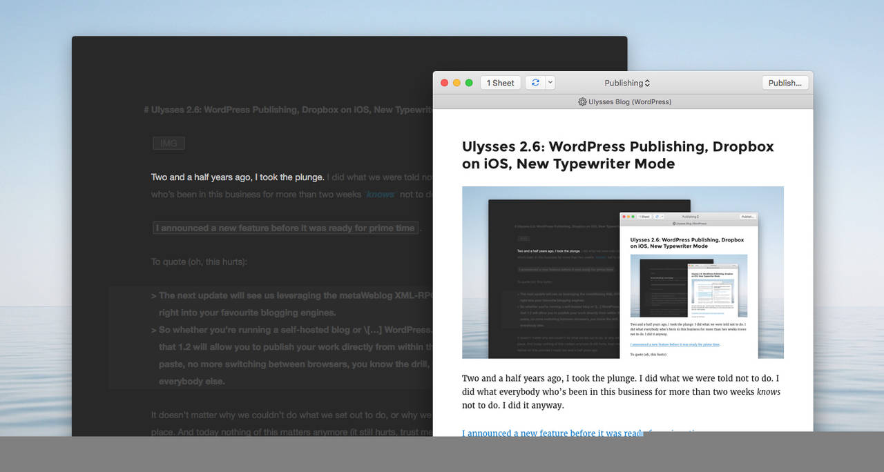 La nuova versione dell’app di scrittura di The Soulmen, Ulysses 2.6, introduce la pubblicazione su WordPress e il supporto per Dropbox su iOS. La principale novità della versione 2.6 è senz’altro la possibilità di pubblicare velocemente su un blog WordPress (sia su WordPress.com sia in self-hosting) senza dover esportare in HTML o Markdown. Inoltre, lo si può fare sia dalla versione desktop sia da quella mobile dell’app, quindi sia su macOS sia su iOS. Si può pubblicare un post o una bozza, sia immediatamente sia programmata. Ulysses 2.6, per rendere più veloce il flusso di lavoro, permette anche di aggiungere tag, categorie, un tempo di pubblicazione, il riassunto e le immagini in primo piano, e consente di vedere l’anteprima del post. Oltre a poter pubblicare anche in movimento anche da un iPad o iPhone (ricordiamo che Ulysses è infatti disponibile anche per lo smartphone della Mela), l’app consente anche di pubblicare da più di un account.