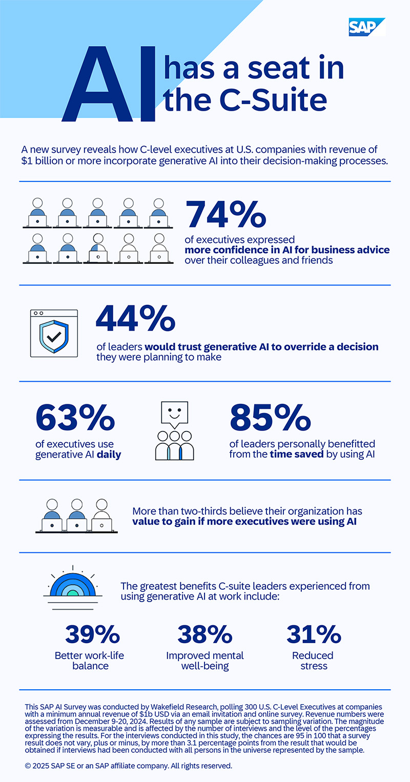 L’indagine “AI Has a Seat in the C-Suite“, condotta da Wakefield Research e sponsorizzata da SAP, ha intervistato 300 dirigenti C-Level di aziende con un fatturato annuo di almeno 1 miliardo di dollari negli Stati Uniti.