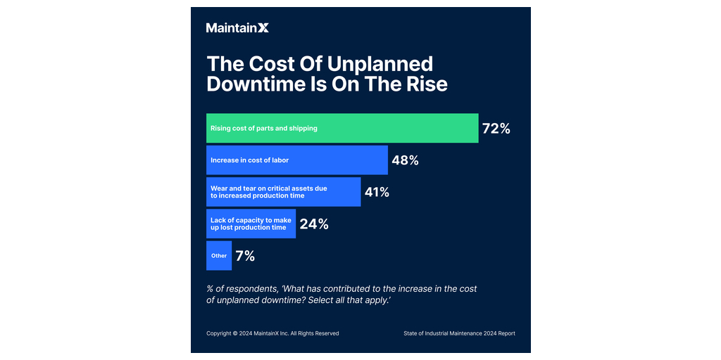 - Parts and Shipping Drive Cost Increases: 72% of facilities attributed the increase in cost of unplanned downtime to the rising cost of parts and shipping.