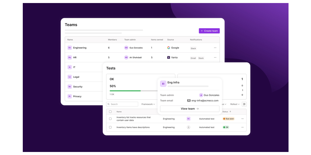 Customers can create teams in Vanta to represent key departments—such as engineering, legal or HR—and assign them as owners, ensuring clear task ownership and more efficient workflows. Teams can also set their own notification preferences via email, Slack or Microsoft Teams, to receive alerts through their preferred communication channel.