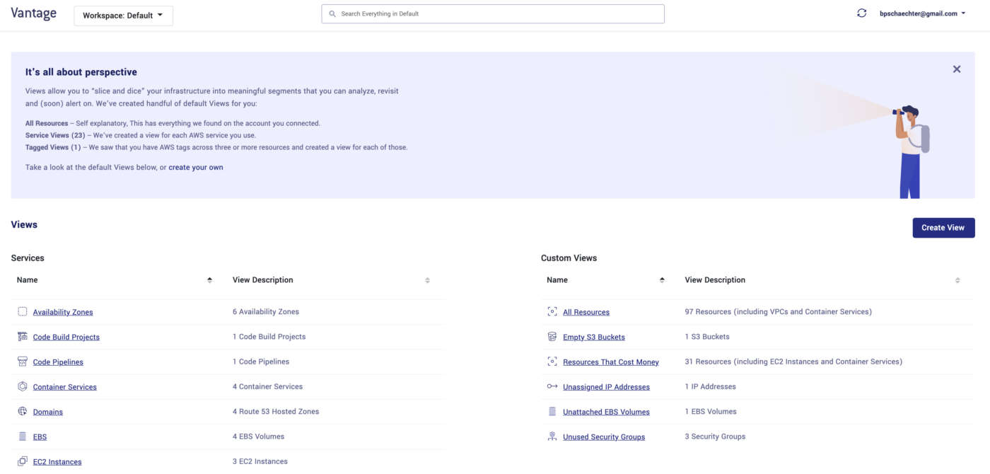 Le Views sono gli strumenti di Vantage che agiscono un po’ come finestre sulla propria infrastruttura cloud: il team di sviluppo le definisce come segmenti significativi di informazioni sui servizi utilizzati.