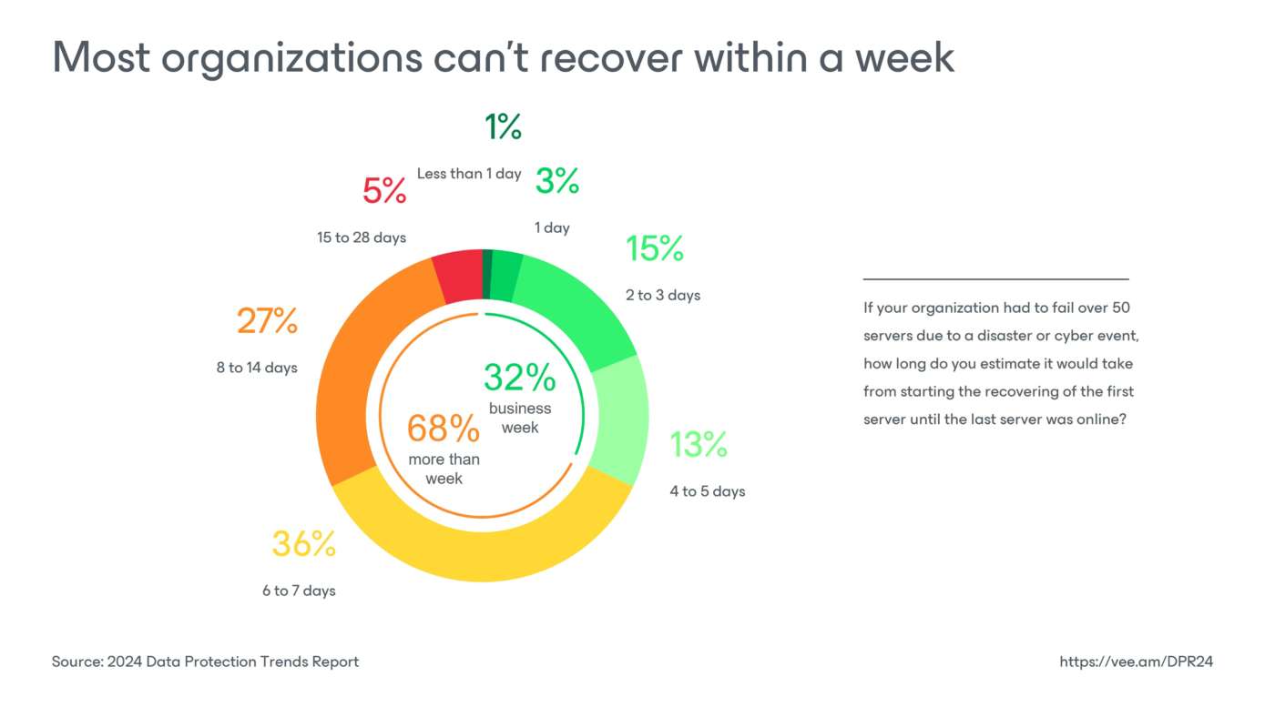• Solo il 32% delle organizzazioni ritiene di potersi riprendere da un piccolo attacco, crisi o interruzione entro una settimana: Sebbene la maggior parte delle organizzazioni consideri la resilienza informatica un aspetto fondamentale della più ampia strategia di business continuity o disaster recovery (BC/DR), la preparazione BC/DR non “supera” la maggior parte delle aspettative SLA. Alla domanda su quanto tempo sarebbe necessario all’IT per recuperare 50 server, solo il 32% ritiene che il personale IT sia in grado di recuperare i server entro cinque giorni lavorativi. Altre statistiche di supporto riflettono il crescente divario tra ciò che le unità aziendali di protezione dei dati si aspettano e ciò che i servizi IT sono in grado di fornire. Quando è stato chiesto loro di effettuare l’ultimo test di cyber/disaster su larga scala, meno di 3 server su 5 (58%) erano recuperabili entro le aspettative.