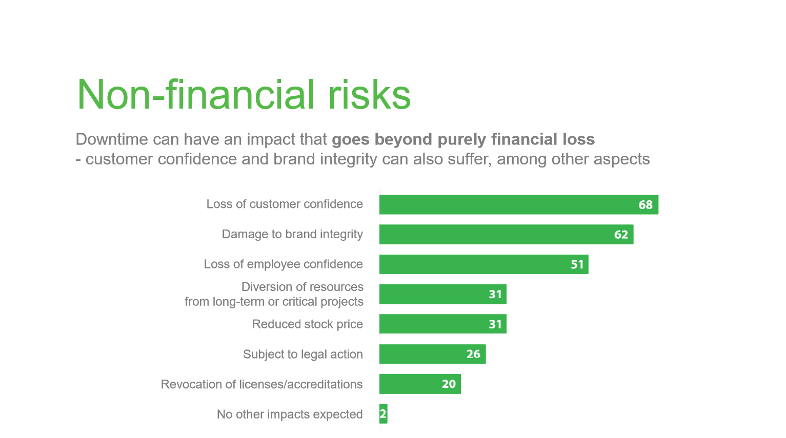I costi dell’indisponibilità sono elevatissimi: mediamente 80 mila dollari per ora di downtime, 90 mila per ora in caso di perdita di dati. I costi possono essere anche maggiori di quelli direttamente calcolabili, poiché in alcuni casi causano perdita di fiducia nel brand (Italia: 53%) ed altre questioni, fino a cause legali o perdita di valore delle azioni (Italia: 40%).