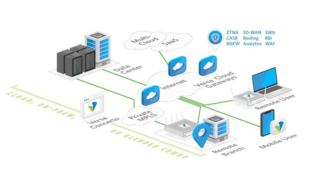 Versa SASE integra sicurezza, networking, SD-WAN e analytics tramite un singolo sistema operative software (VOS, Versa Operating System) deliverato via cloud, on-premise o in configurazione ibrida come combinazione di entrambi.