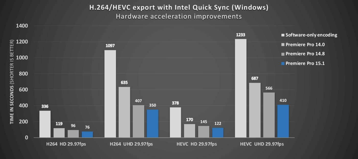 Per quanto riguarda l’aggiornamento di aprile 2021 di Premiere Pro (versione 15.1), Adobe ha dichiarato che, su Windows, nuove ottimizzazioni migliorano ulteriormente i tempi di esportazione utilizzando l’accelerazione hardware Intel Quick Sync. La nuova versione sarebbe fino a 1,8x più veloce di Premiere Pro 14.0.