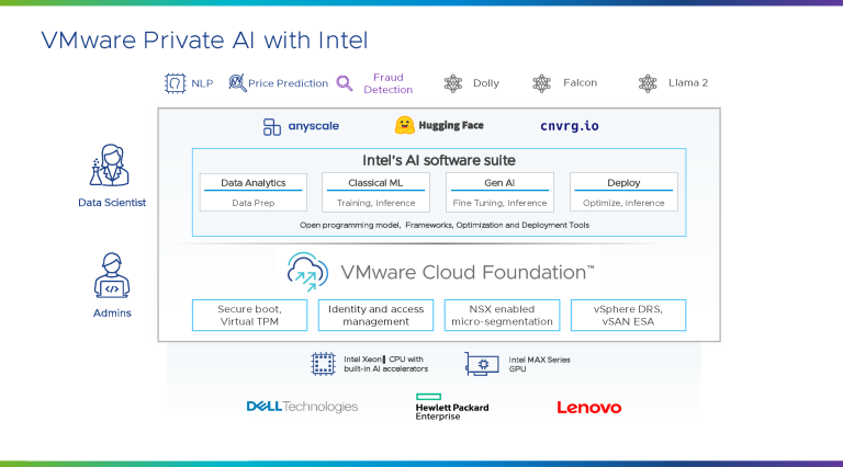 VMware Private AI sarà supportato da server di Dell Technologies, Hewlett Packard Enterprise e Lenovo con CPU Xeon di quarta generazione con Intel Advanced Matrix Extensions (Intel AMX) e GPU Intel Max Series.