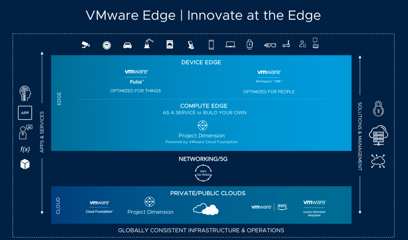 Oltre a essere indicato per implementazioni di data center centrali, dove non siano a disposizione infrastrutture IT dedicate in grado di gestire direttamente un cloud privato, Project Dimension, che fa parte della più ampia strategia VMware Edge, è ideale per implementazioni alla frontiera, dove sia necessario minimizzare la latenza nell’elaborazione dei dati, evitando di trasferirli verso e dal cloud per effettuare i calcoli; ridurre la larghezza di banda necessaria verso il cloud, minimizzando la quantità di dati da trasferire a seguito di una prima elaborazione locale; mantenere la continuità di servizio indipendentemente dalla connessione alla Rete.