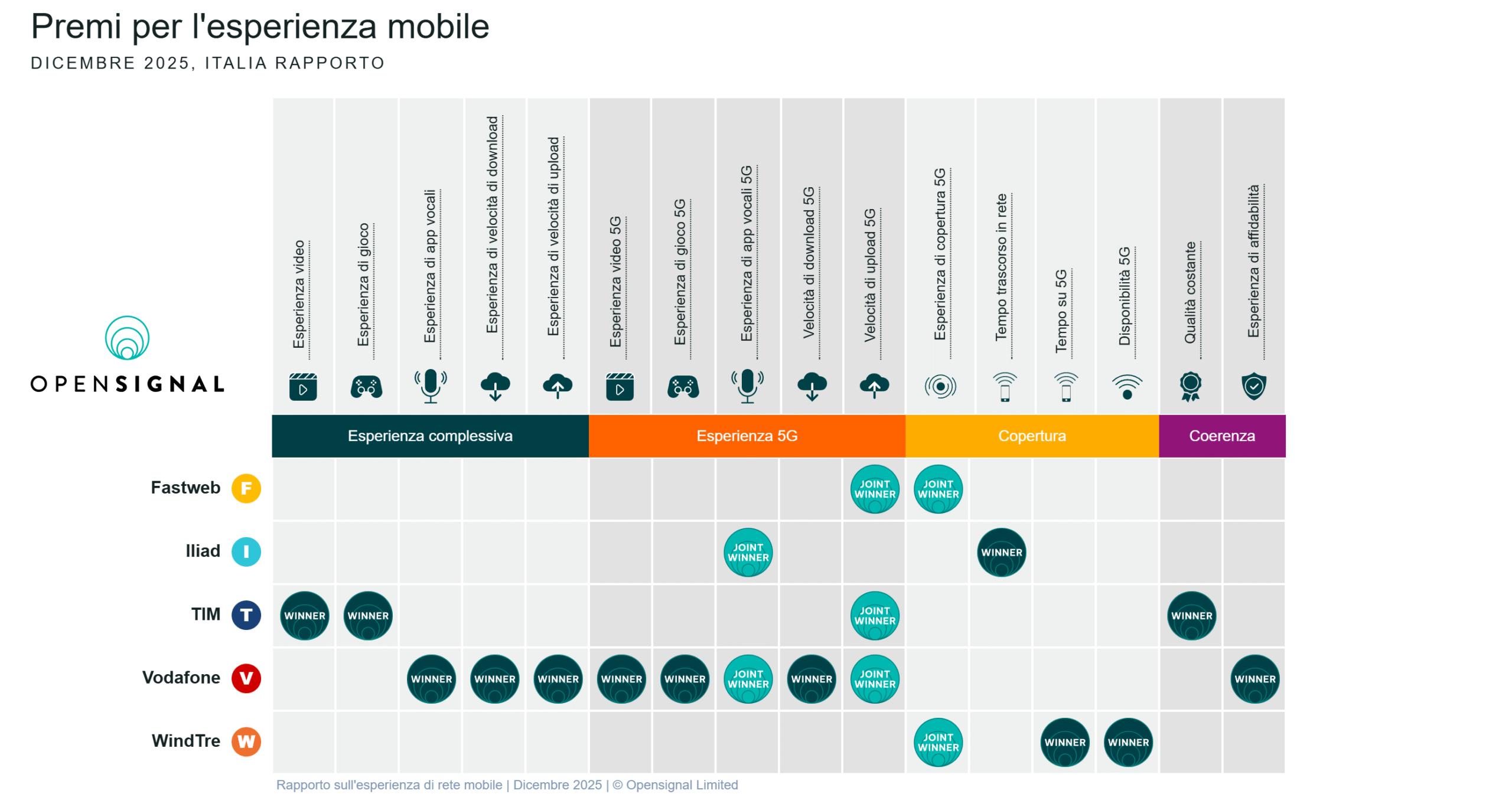 Nel report Opensignal, Vodafone conquista 9 premi su un totale di 16, di cui sette in esclusiva e due condivisi. Un risultato che non lascia spazio a interpretazioni ambigue. TIM segue a distanza con quattro riconoscimenti complessivi, mentre WindTre, Iliad e Fastweb si fermano a tre o meno premi ciascuno.