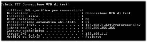 Dal momento che il primo IP assegnabile ai client (vedasi l’impostazione del parametro remoteip) è 192.168.1.234, digitando dal prompt dei comandi di Windows IPCONFIG /ALL, si troverà qualcosa di simile: