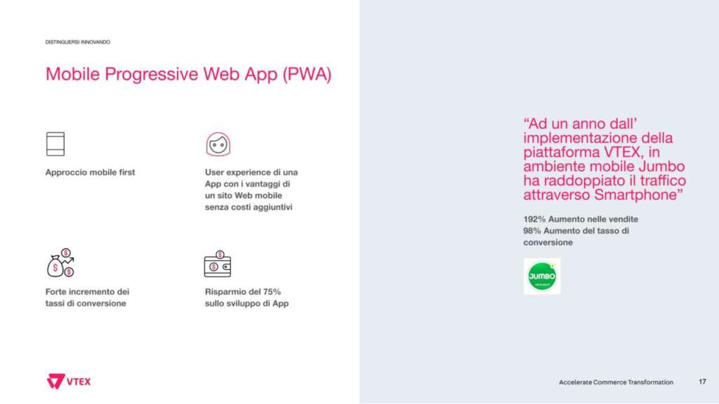 Dal punto di vista tecnologico, l’adozione di Mobile Progressive Web App offre al cliente una user experience tipica delle app, ma con una pagina web. Una tendenza che si sta facendo sempre più strada, e Vtex dimostra di saper capire in anticipo le richieste del mercato e le aspettative del cliente.
