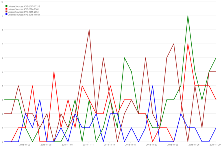 Osservando i dati honeypot nel mese di novembre Netscout ha riscontrato una serie enorme di attività legate allo sfruttamento di Hadoop YARN come descritto in “Mirai: Not Just For IoT Anymore”. Nell’ambito degli assalti legati alle richieste ad Hadoop YARN è stato notato un insieme di vulnerabilità IoT più obsolete quali CVE-2014-8361, CVE-2015-2051, CVE-2017-17215 e CVE-2018-10561.