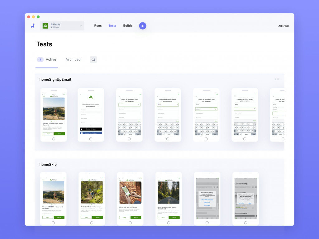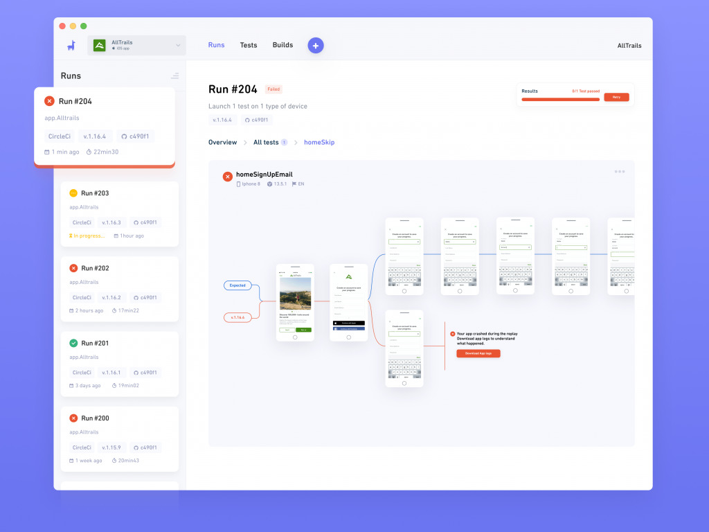 Waldo poi ripete in modo affidabile tutti i test registrati su ogni nuova versione dell’app, in modo automatico. Ciò è utile per testare un nuovo flusso o per assicurarsi che una nuova funzionalità non abbia causato accidentalmente dei malfunzionamenti in qualcos’altro nell’app.