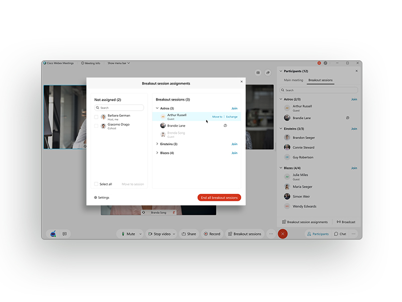 Le Breakout Room (sessioni interattive per dividere i partecipanti a una riunione in gruppi più piccoli) in Webex Meetings, consentono discussioni più mirate: possono essere predefinite o create al volo, e grazie ad esse i team possono incontrarsi, condividere contenuti e spostarsi facilmente tra le sessioni secondo necessità.