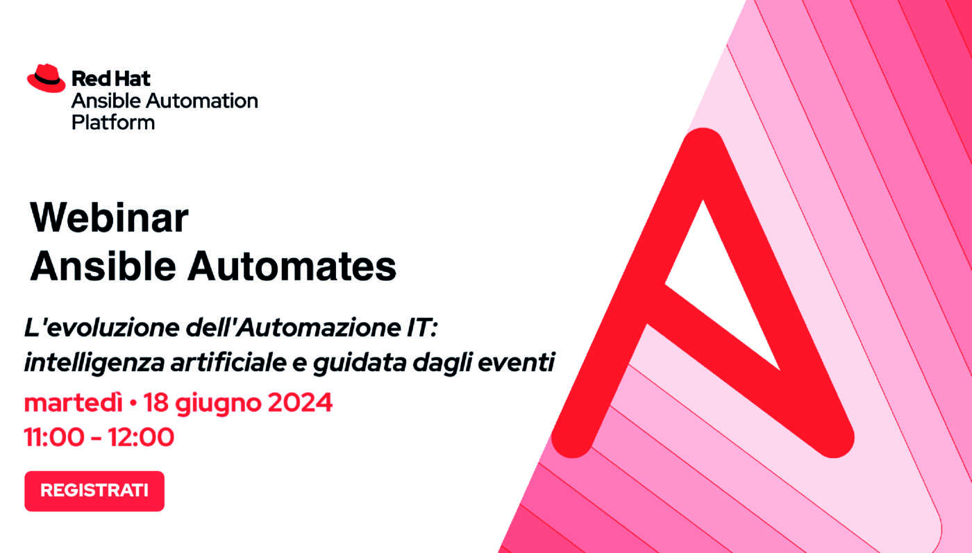 Questo webinar, gratuito e in italiano, ha lo scopo di presentare Event-Driven Ansible e come sia in grado di fornire la capacità di gestione degli eventi necessaria per automatizzare attività dispendiose in termini di tempo e rispondere alle mutevoli condizioni presenti in qualsiasi realtà IT. Sarà inoltre approfondito Ansible Lightspeed with watsonx Code Assistant, un nuovo servizio di IA generativa progettato da e per gli sviluppatori e gli operatori dell’automazione Ansible.