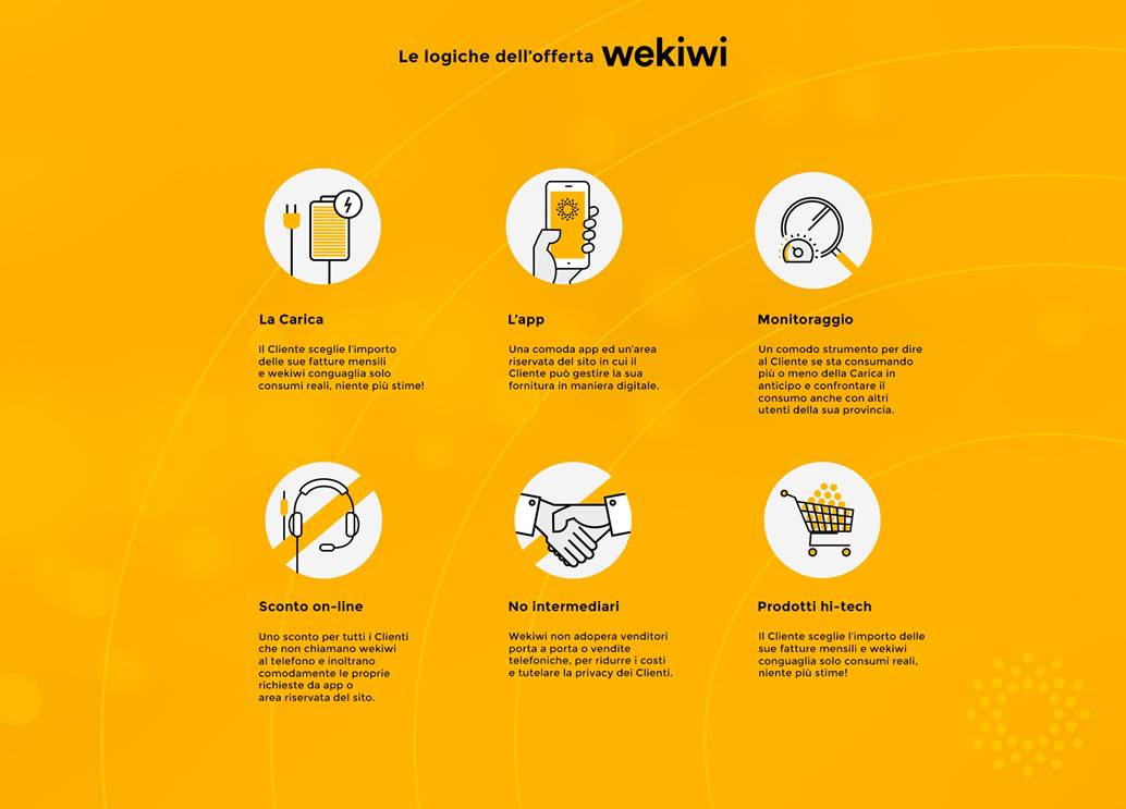 Ci pensa Gioele Dix in un spot a fornire una lettura cinica ma veritiera di una bolletta della maggior parte dei fornitori di energia. Wekiwi tenta di eliminare tutta la complessità partendo da un primo assunto: si fa tutto da un browser web o da una app, il servizio e la bolletta sono totalmente digital.