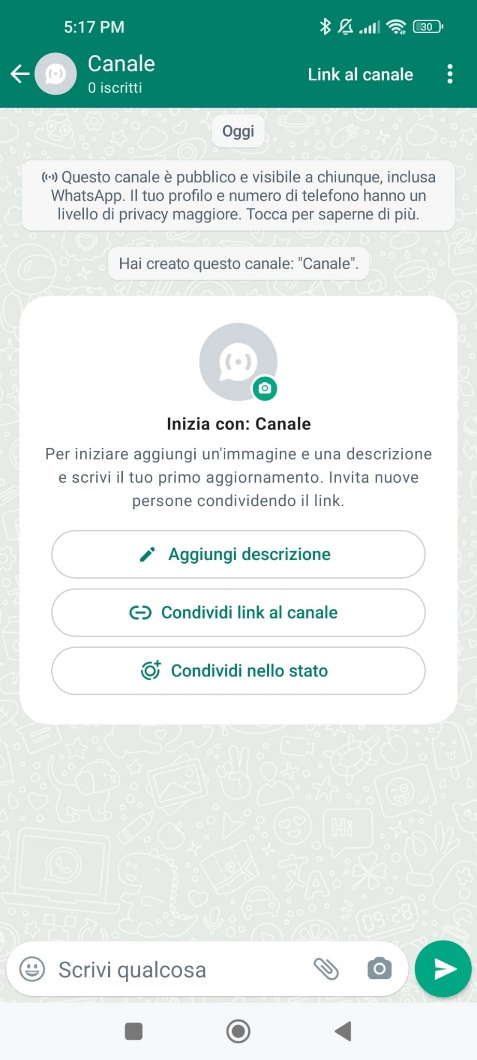 Se si desidera aprire un nuovo canale è necessario selezionare “Crea canale”, leggere le avvertenze e premere “Continua”. A questo punto l’utente può scegliere un’immagine, un nome e una descrizione e confermare. Ecco fatto, adesso il nuovo spazio di condivisione è pronto e pubblico, non resta altro da fare che renderlo popolato. Ma come fare? Nella pagina che si apre dopo la creazione, una semplice chat vuota, è presente un tasto che consente di copiare il link per accedere al canale e condividerlo, e un tasto per inserirlo nel proprio stato di WhatsApp.