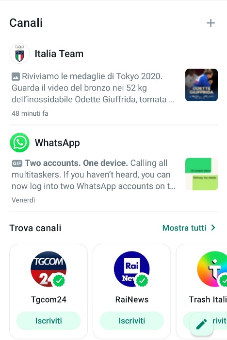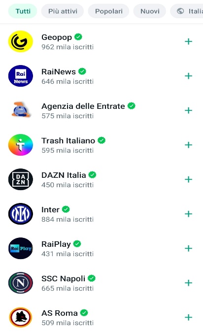 Tornando al menù principale della sezione “Aggiornamenti” (o Canali, su PC) e scorrendo fino in fondo si trovano sia i canali a cui si è iscritti, sia alcuni canali suggeriti dalla piattaforma agli utenti.