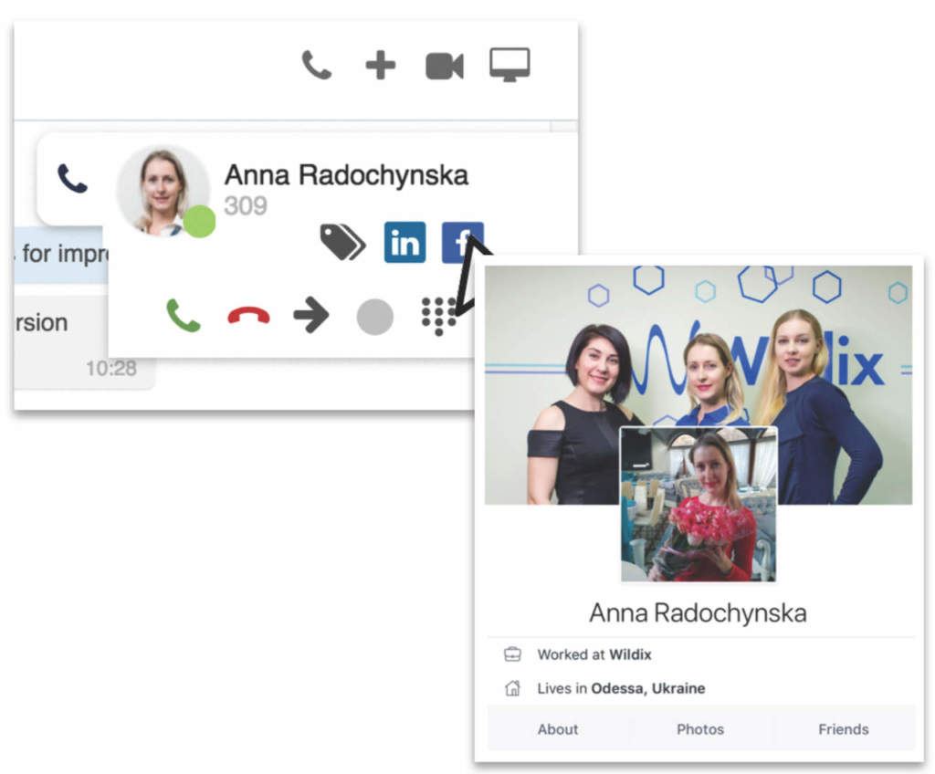 Per ottenere maggiori informazioni sul chiamante di cui si è riconosciuto il nome, sarà possibile ricercarne automaticamente eventuali profili Facebook o Linkedin (Social Lookup), nel rispetto della privacy, tiene a sottolineare Wildix.
