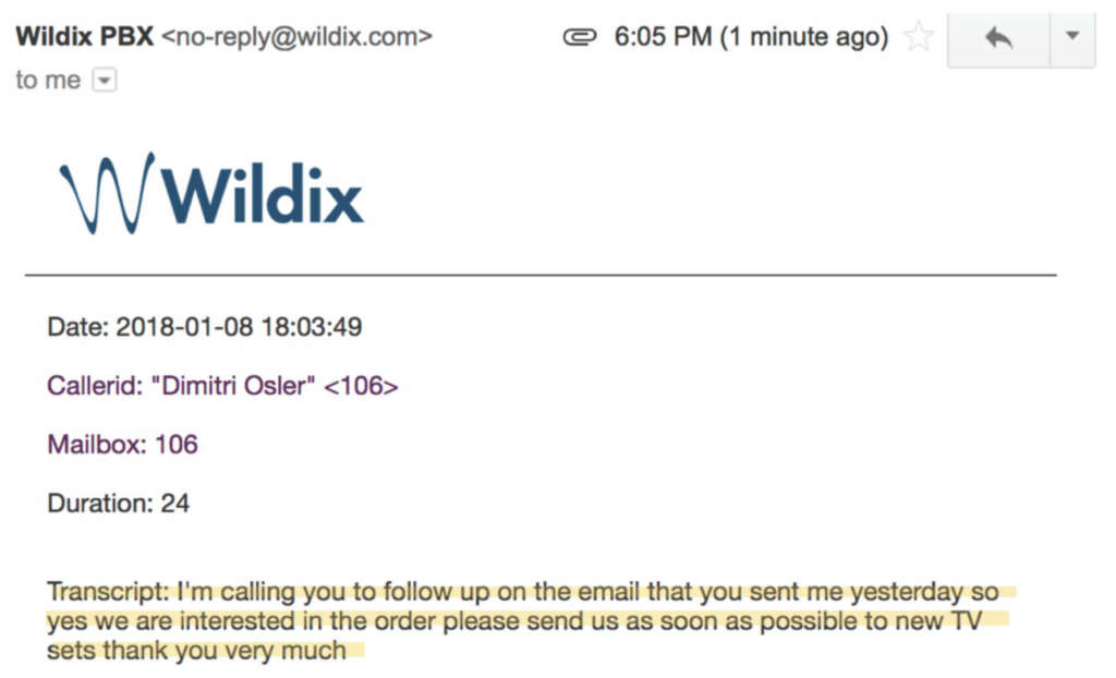 Grazie ai servizi Speech to Text offerti sul cloud da Google e Amazon, sempre più precisi nel riconoscimento senza necessità di training e indipendenti dalla voce dello speaker, Wildix introdurrà la Voicemail Transcription, inserendo nel corpo della mail la trascrizione del messaggio depositato nella casella vocale. Quando ragioni legali o di business lo rendano necessario, sarà possibile trascrivere anche le chiamate registrate, facilitandone l’archiviazione e l’indicizzazione.