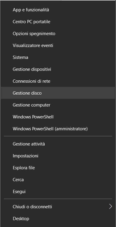Per fare questo, per prima cosa facciamo clic con il pulsante destro del mouse sul pulsante del menu Start e selezioniamo Gestione disco.
