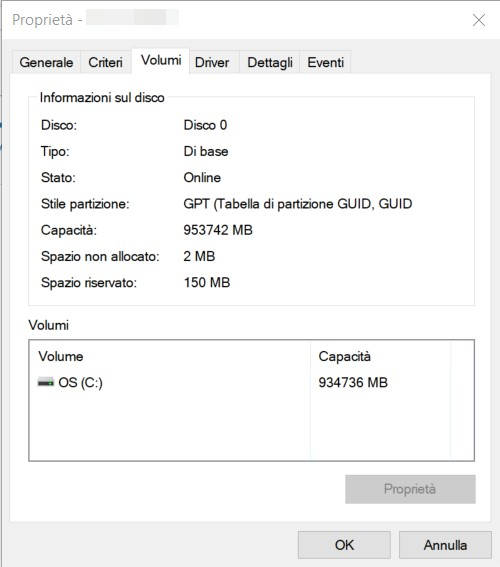 Selezioniamo quindi il tab Volumi della finestra Proprietà: tra le informazioni sul disco, sarà possibile verificare quale sia lo stile di partizione.