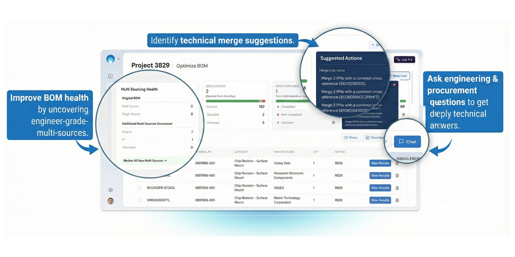 The Agentic BOM Engine delivers engineer-grade analysis and procurement-grade intelligence to every BOM decision. Teams get validated alternates, supplier-merge opportunities, and clear visibility into cost and sourcing risks in minutes, helping engineering, sourcing, and reliability teams make faster, better-aligned decisions from design through production.