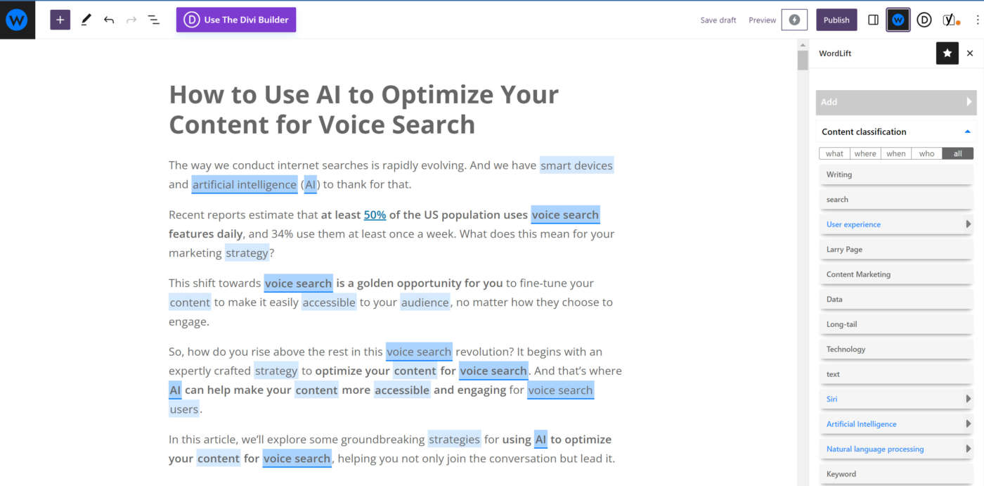 Aiuta Google a comprendere meglio i nostri contenuti, aumentando così la probabilità che questi vengano rilevati per le ricerche vocali. Come abbiamo già detto, WordLift si occupa di SEO semantica.