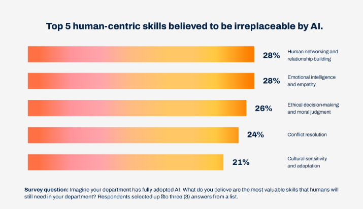 Le competenze che si ritiene abbiano meno probabilità di essere sostituite dall’AI sono anche considerate le più preziose nel lavoro: la capacità di prendere decisioni etiche, la creazione di connessioni e relazioni, l’intelligenza emotiva e l’empatia e la risoluzione dei conflitti. In diversi scenari, prendere decisioni etiche è risultata essere la competenza human-centric più preziosa, sia oggi, sia in un futuro caratterizzato dalla piena adozione della tecnologia.