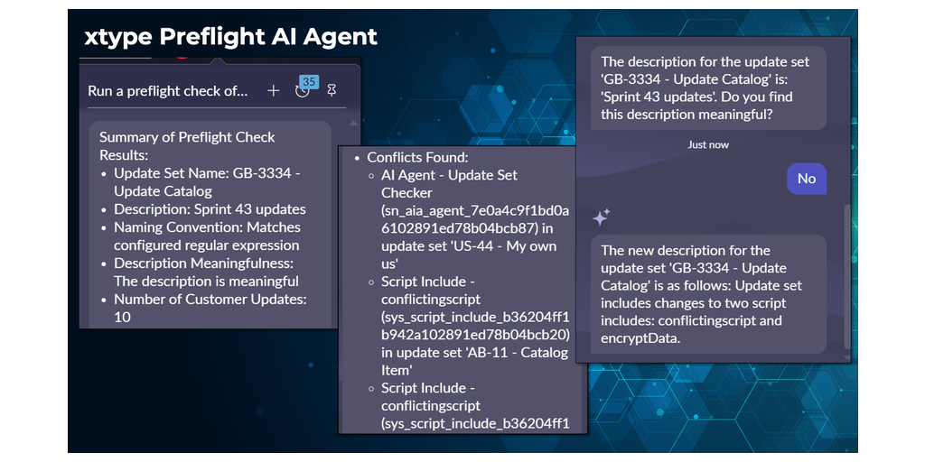 As organizations continue to manage multiple ServiceNow instances across development, QA, and production, xtype Preflight AI helps teams identify common issues before they become problems, including naming convention conformity, meaningful descriptions and update set conflicts.