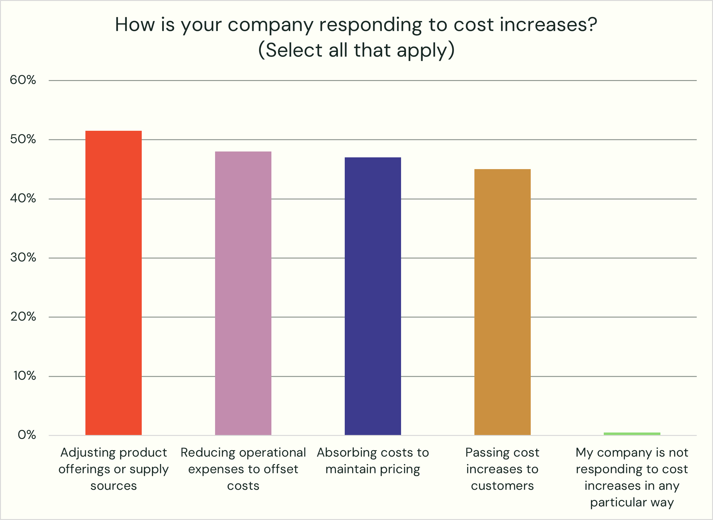 • 42% report shifting suppliers or sourcing regions in response to tariff changes and 45% of businesses are reducing operational expenses to offset tariff costs
