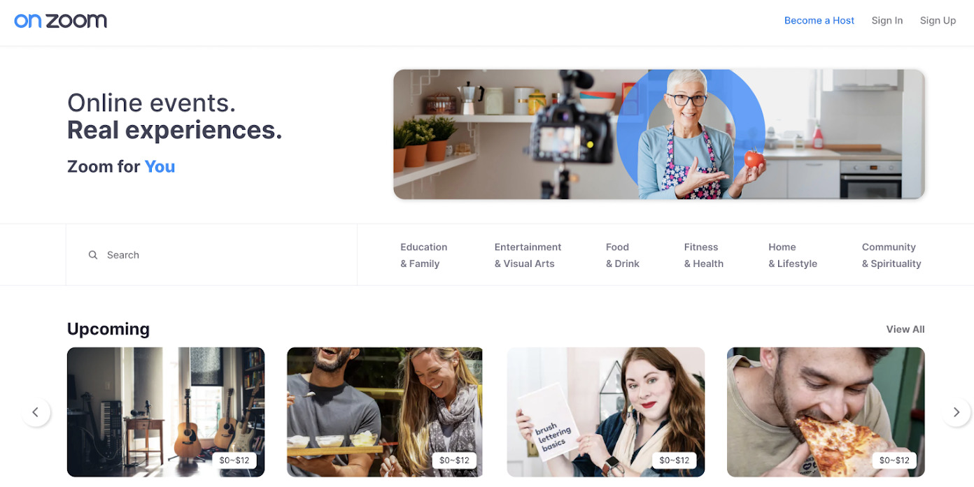 Gli utenti di Zoom possono scoprire questi eventi e iscriversi a nuove esperienze con funzionalità aggiuntive come i biglietti regalo e una dashboard per i partecipanti, per tenere sotto controllo gli eventi e i marchi preferiti. OnZoom è al momento disponibile come beta pubblica per gli utenti degli Stati Uniti.