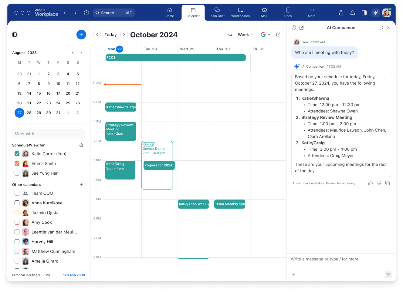 - Contesto ampliato: AI Companion acquisisce una comprensione contestuale avanzata basata su ciò che l’utente sta guardando nell’app Zoom Workplace e sulle conversazioni precedenti, per fornire suggerimenti e risposte intelligenti corredati da citazioni.